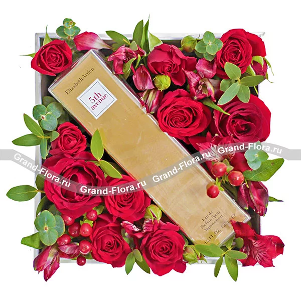 Стандартный: роза красная - 5 шт., роза кустовая красная - 1 шт., альстромерия красная - 1 шт., гиперикум, эвкалипт, декоративная зелень, парфюм Elizabeth Arlen - 30ml., оазис, коробка.